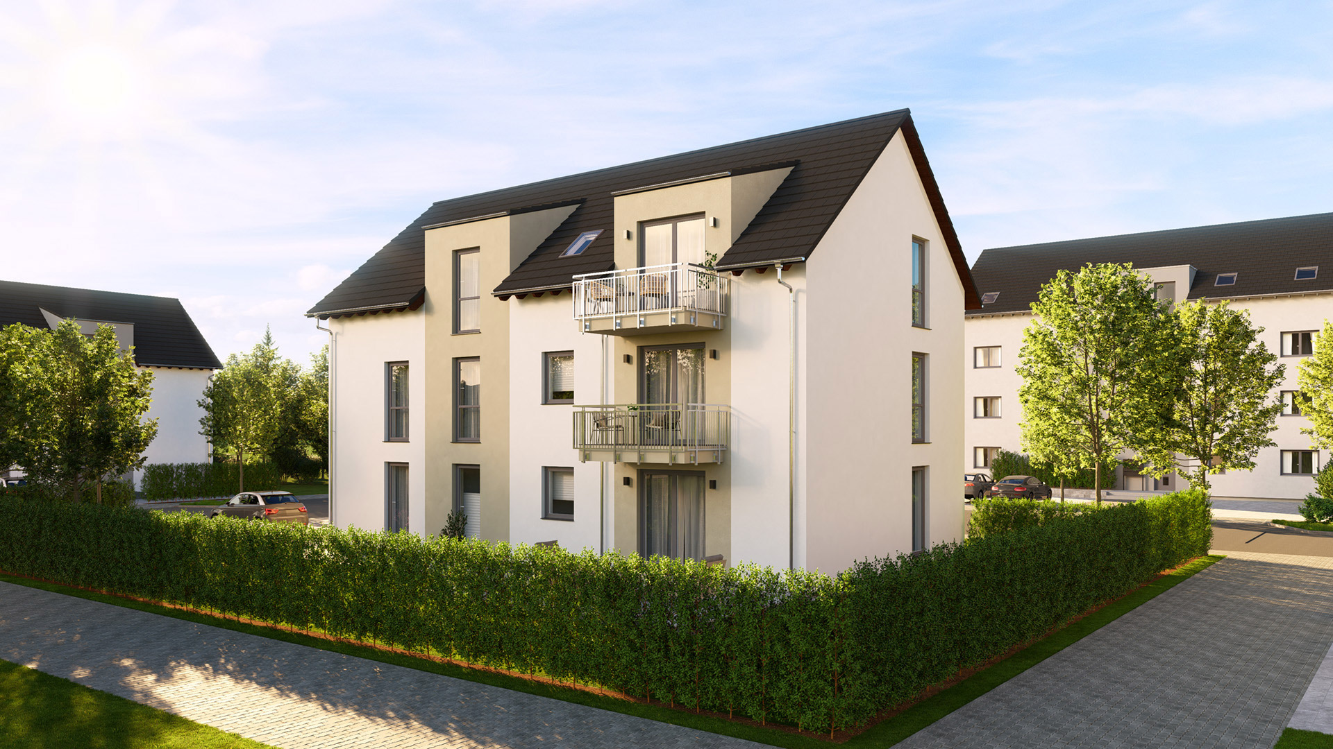 Auf drei Ebenen verteilt bietet dieses zeitgemäße Mehrparteienhaus drei hochwertige Wohneinheiten und stellt damit ein ideales Konzept für effizientes Wohnen in kompakter Form dar. Die Wohnungen in den Obergeschossen verfügen jeweils über einen Balkon, der den Wohnraum harmonisch nach außen erweitert. Der offene Grundriss jeder Wohneinheit verbindet eine großzügige Küche mit Kochinsel nahtlos mit einem gemütlichen Ess- und Wohnbereich und schafft so ein komfortables und zeitgemäßes Wohnambiente. Die klare und charaktervolle Architektur des Gebäudes wird durch das fassadengleiche Zwerchhaus mit Flachdach unterstrichen. Die durchdachte Raumaufteilung und die hochwertige Ausstattung machen dieses Objekt zu einem attraktiven Konzept für anspruchsvolles, modernes Wohnen in überschaubarer Größe.