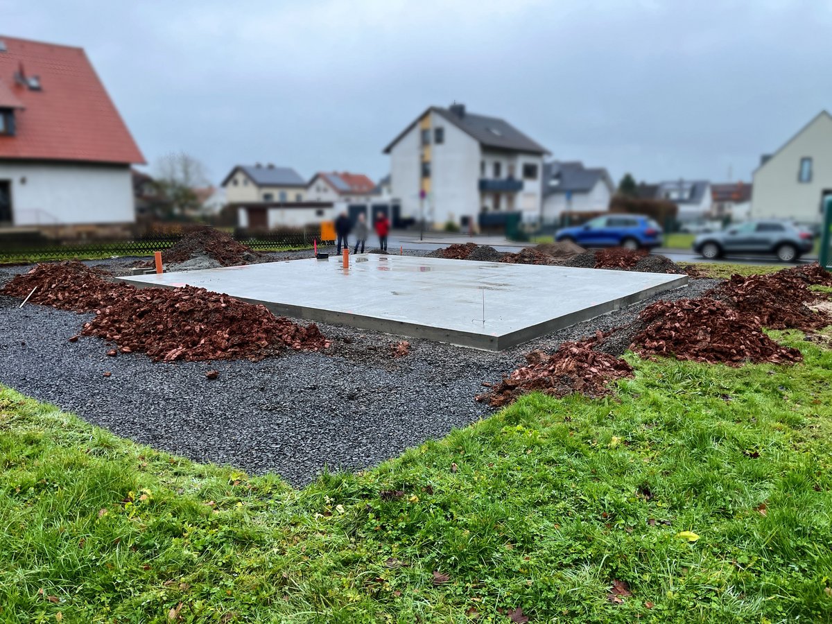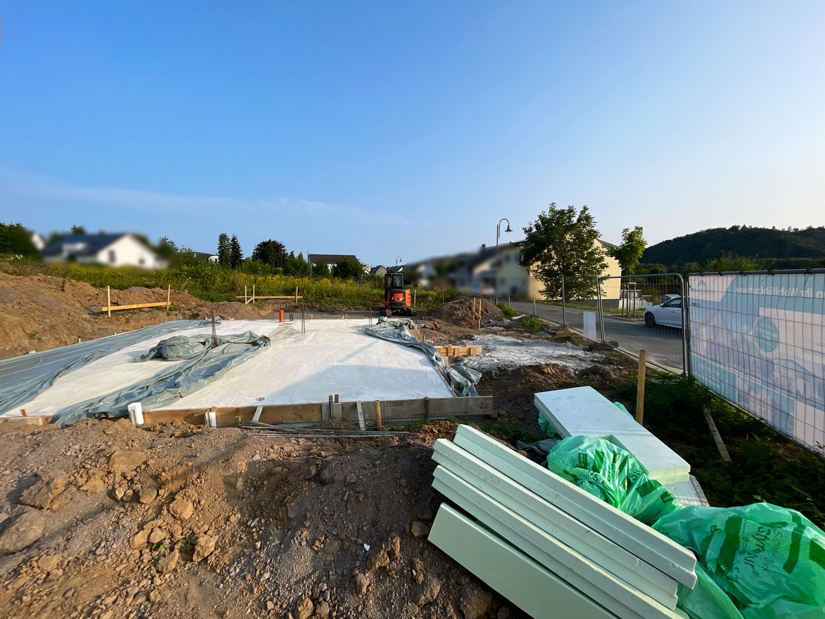 Baustelleneinrichtung erfolgt, Bodenplatte fertiggestellt, Vorbereitung für die Hausmontage