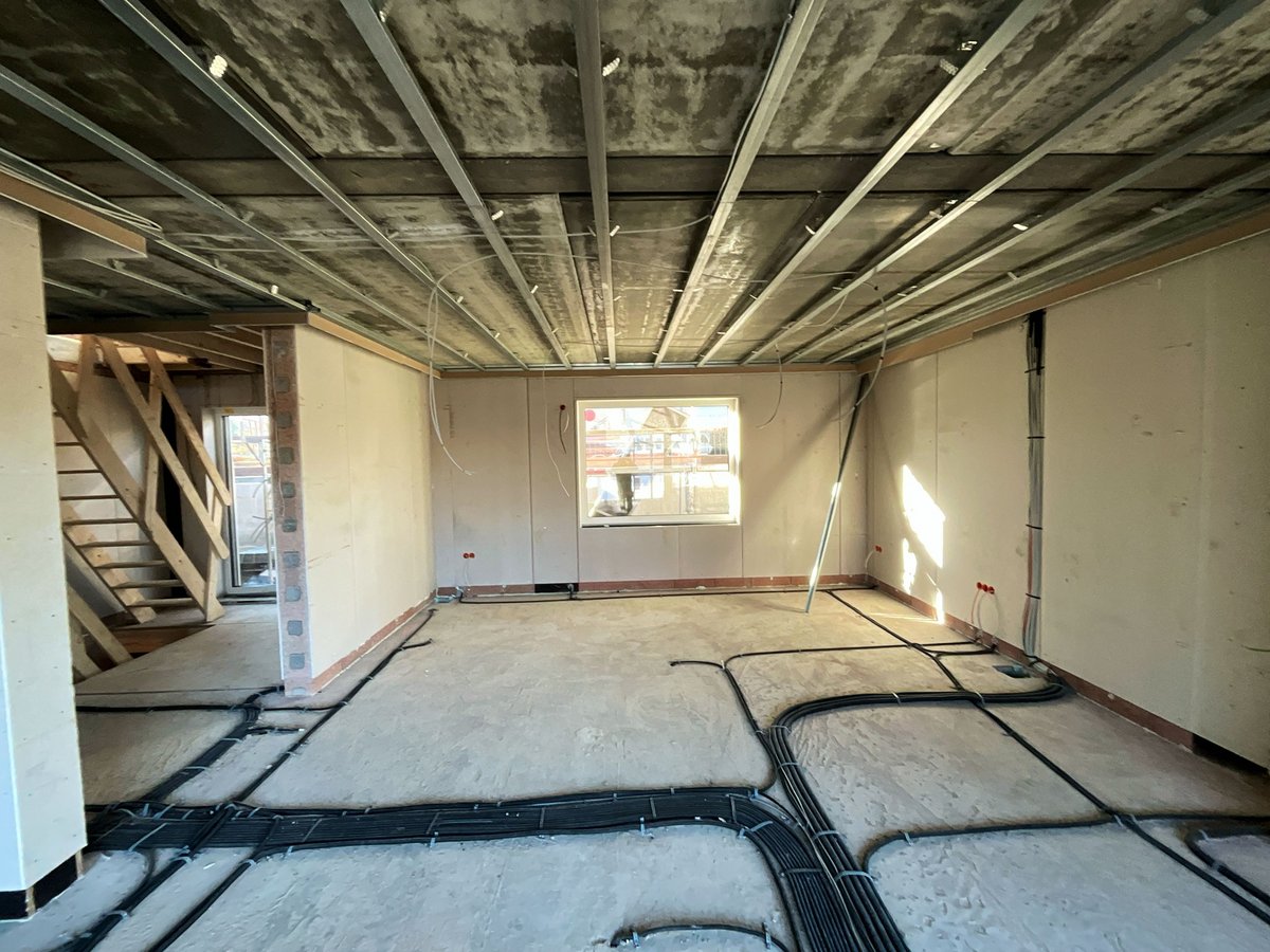 Elektro & Heizungsanlage, Estrich getrocknet, verspachtelt und verputzt