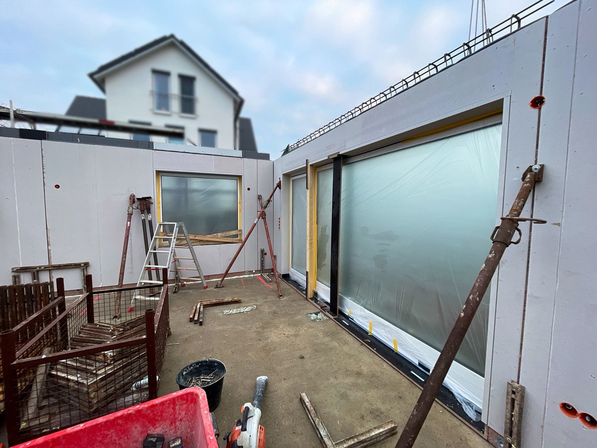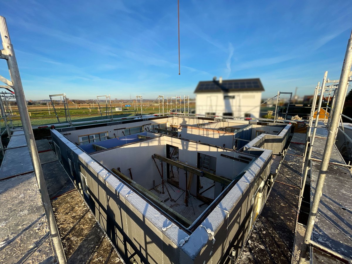 Hausmontage des Erdgeschosses abgeschlossen, Betondecken verlegt, Obergeschoss in Ausführung