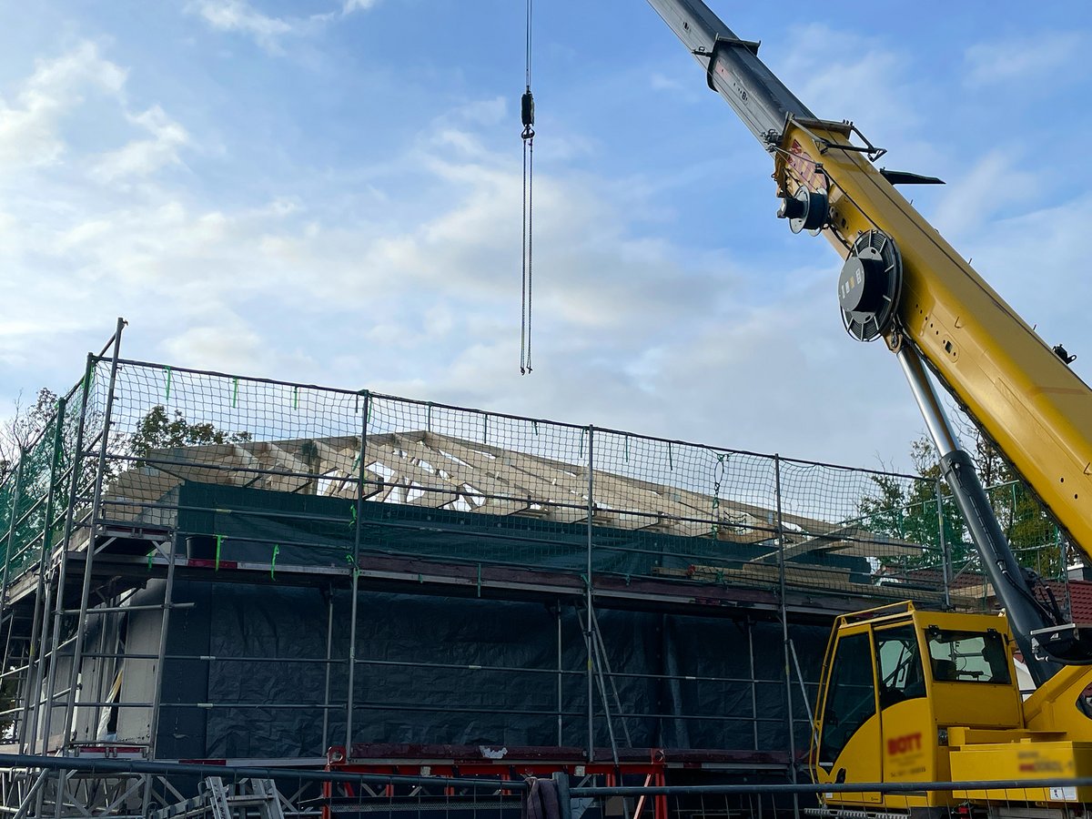 Rohbau abgeschlossen, Dachkonstruktion sowie Eindeckung fertiggestellt, Einarbeitung der Dachdämmung