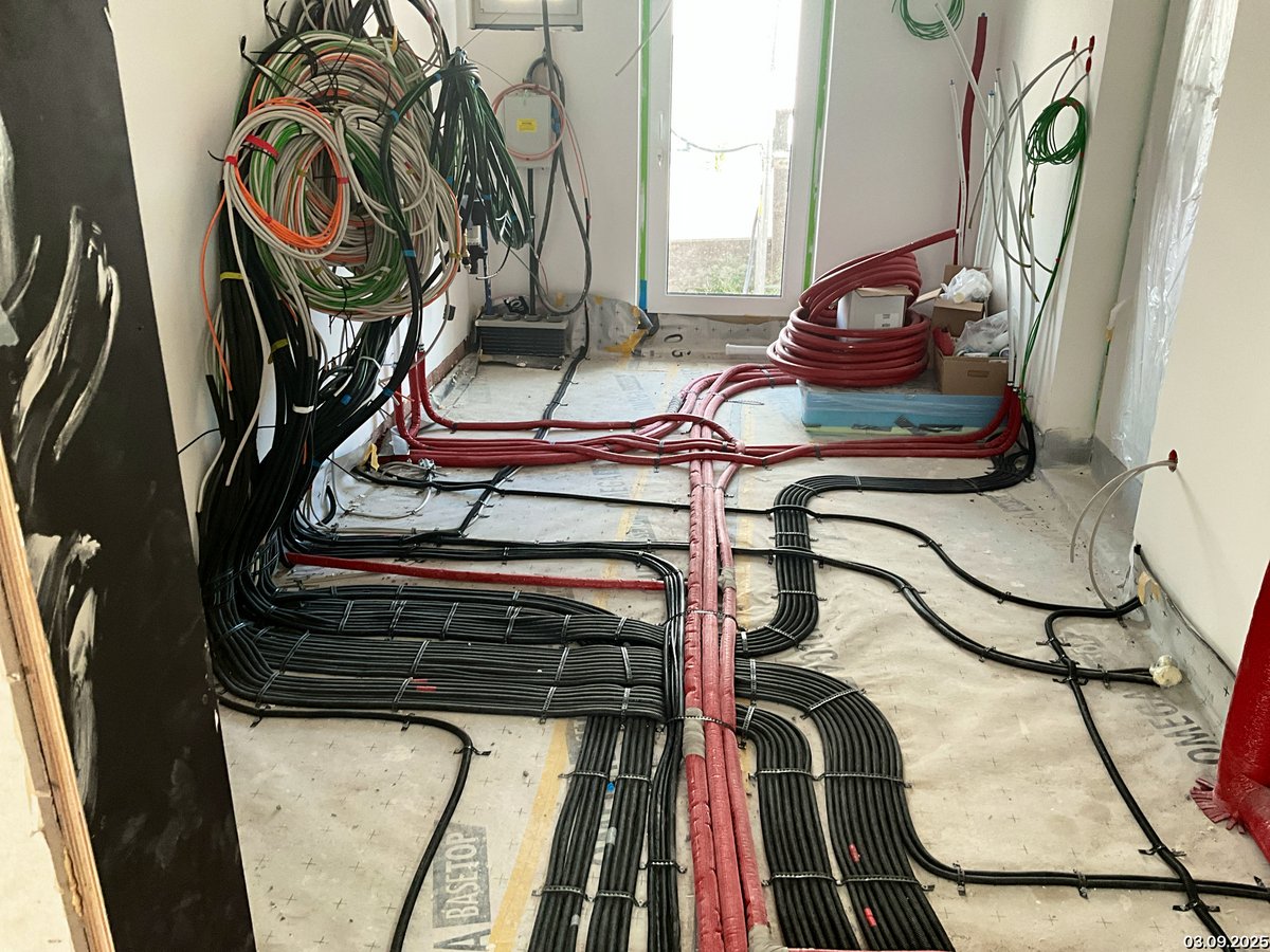 Rohinstallation Elektro abgeschlossen, Vorbereitung für den Zählerschrank vollständig umgesetzt, Rohinstallation Heizung in Ausführung, Bauseitige Leistung: Hausanschlusskasten eingebaut