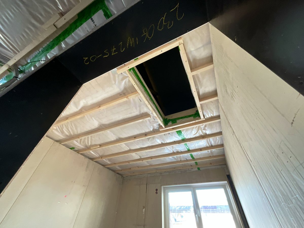 Hausstellung erfolgt, Rohbau abgenommen, Trockenbauer hat mit Dachdämmung begonnen