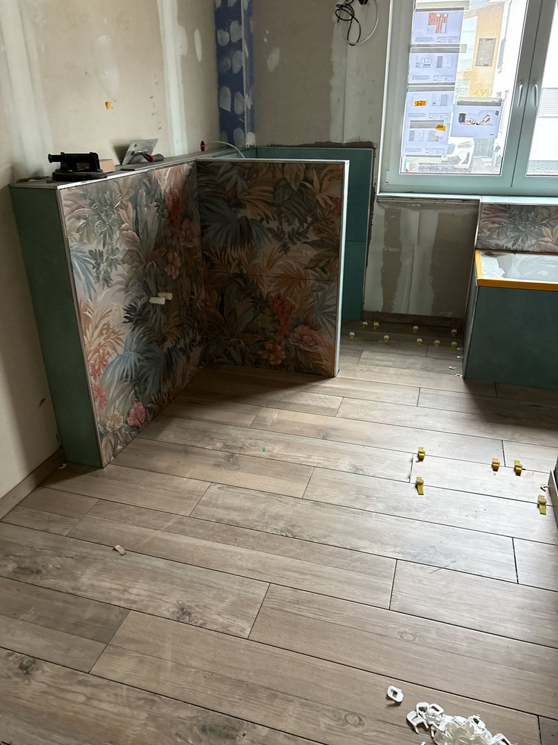 Estrichtrocknung abgeschlossen, Spachtelarbeiten fertiggestellt, Fliesenarbeiten in Ausführung