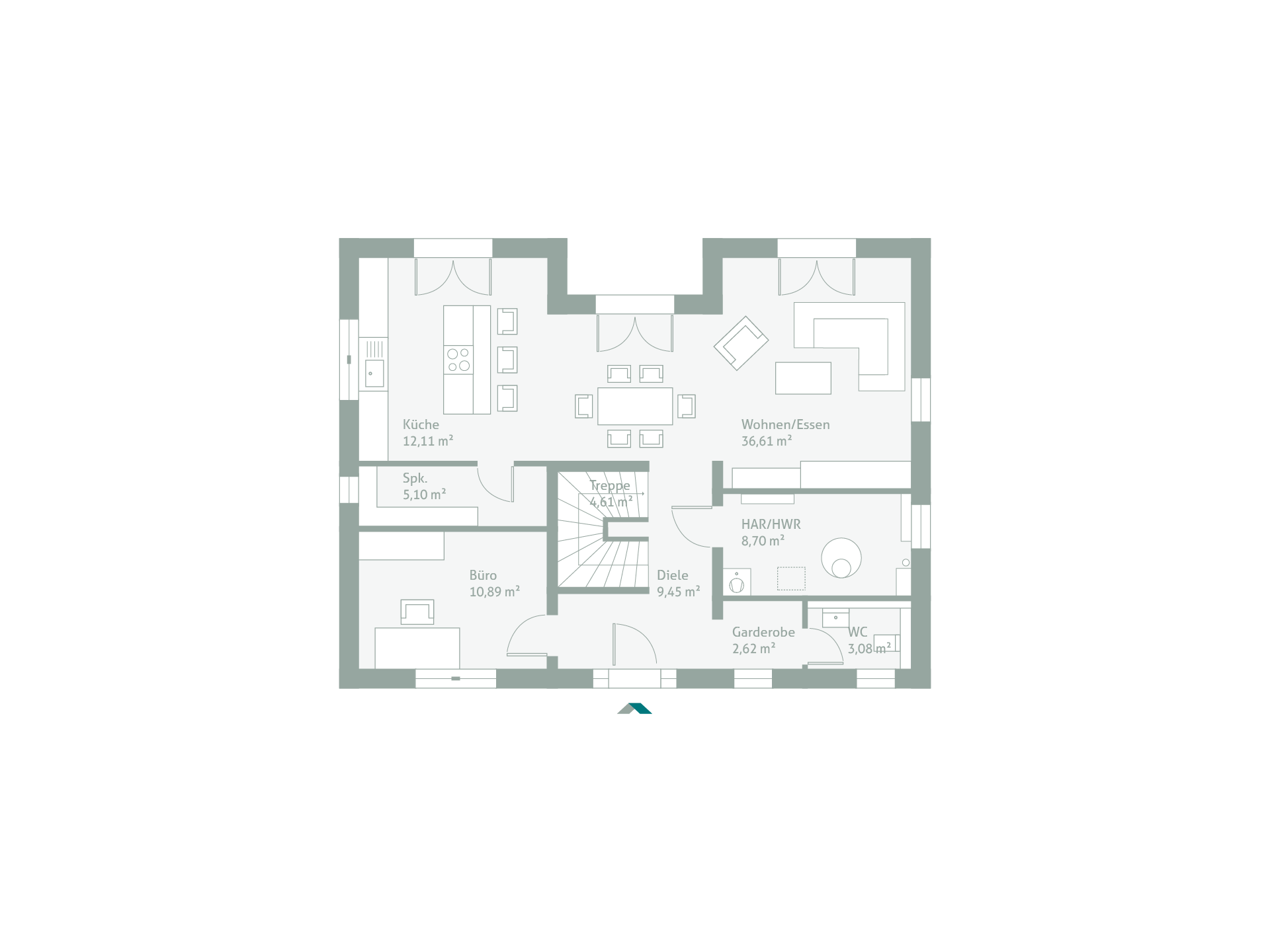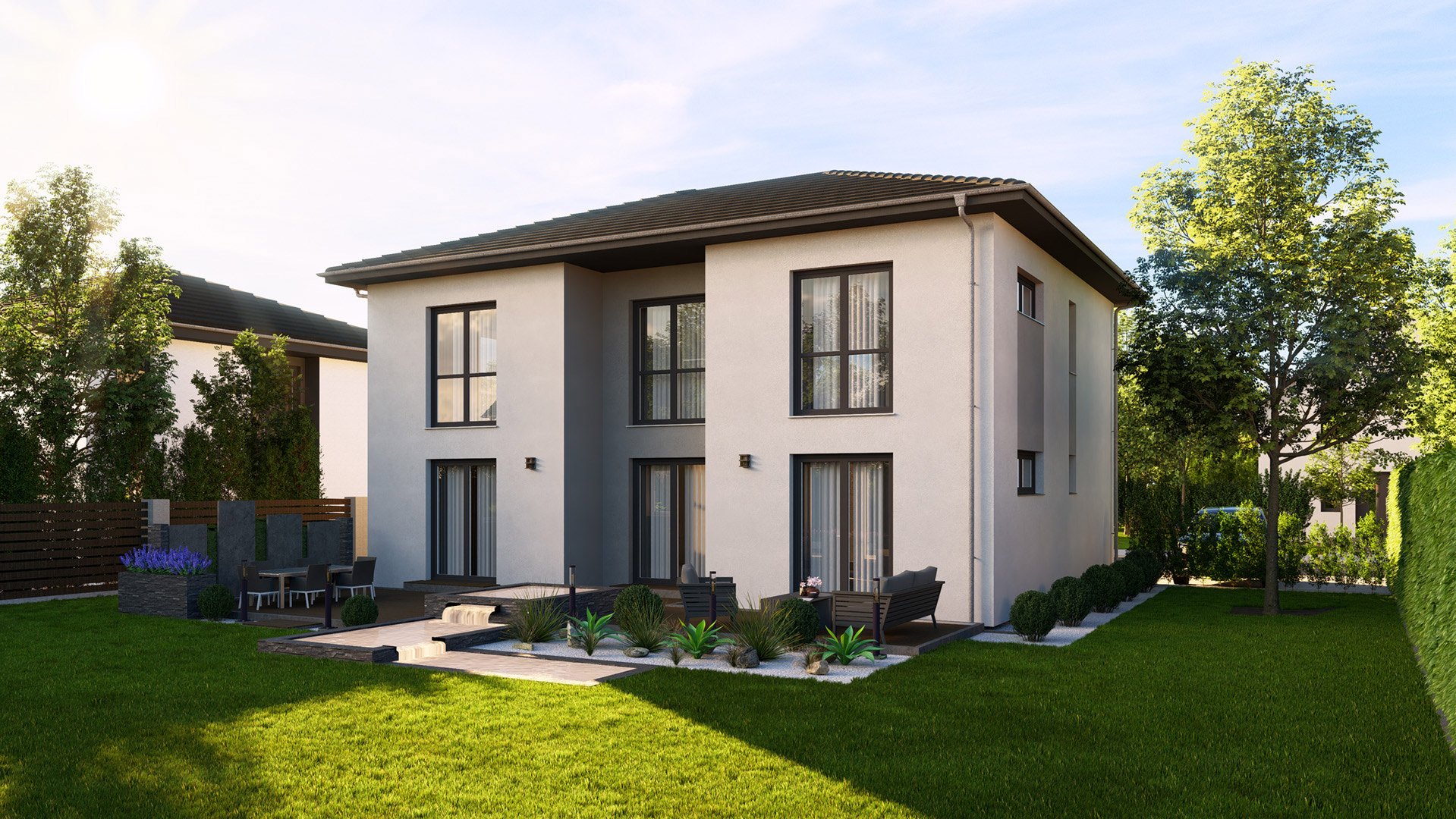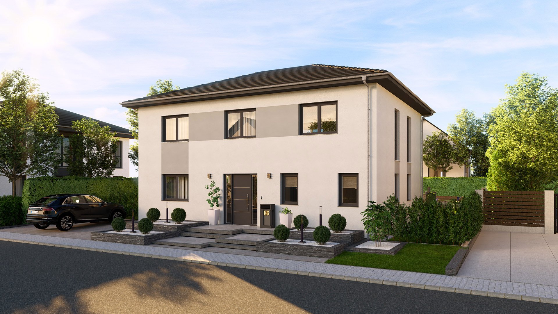 In diesem stilvollen Einfamilienhaus wird die offene Wohnküche mit freistehender Kochinsel durch eine separate Speisekammer ergänzt. Vor allem der Ess- und Wohnbereich lädt durch sein großzügiges, offenes Konzept ein und bietet viel Platz für die ganze Familie. Ein zusätzlicher Raum für verschiedene Nutzungsmöglichkeiten sorgt für Flexibilität. Im Obergeschoss erwartet Sie ein Elternschlafzimmer mit angrenzender Ankleide und direktem Zugang zum geräumigen Badezimmer. Außerdem befinden sich hier zwei große Kinderzimmer sowie eine gemütliche Diele. Das gesamte Objekt besticht durch seine lichtdurchfluteten Räume, die durch die großen Fenster eine helle und freundliche Atmosphäre schaffen. Zudem verfügt das Haus über einen zurückgesetzten, überdachten Terrassenbereich, der zusätzlichen Wohnraum im Freien bietet.