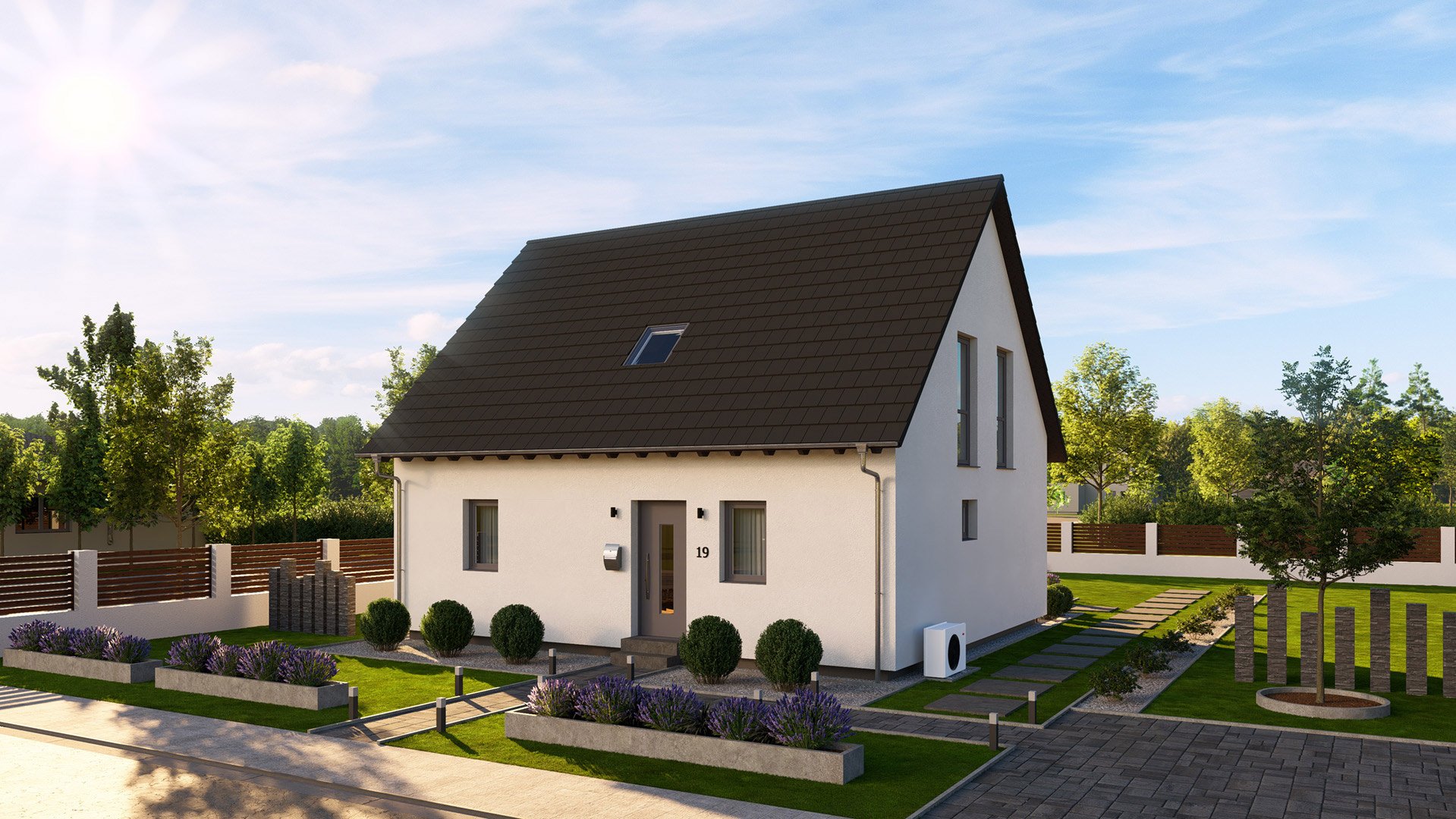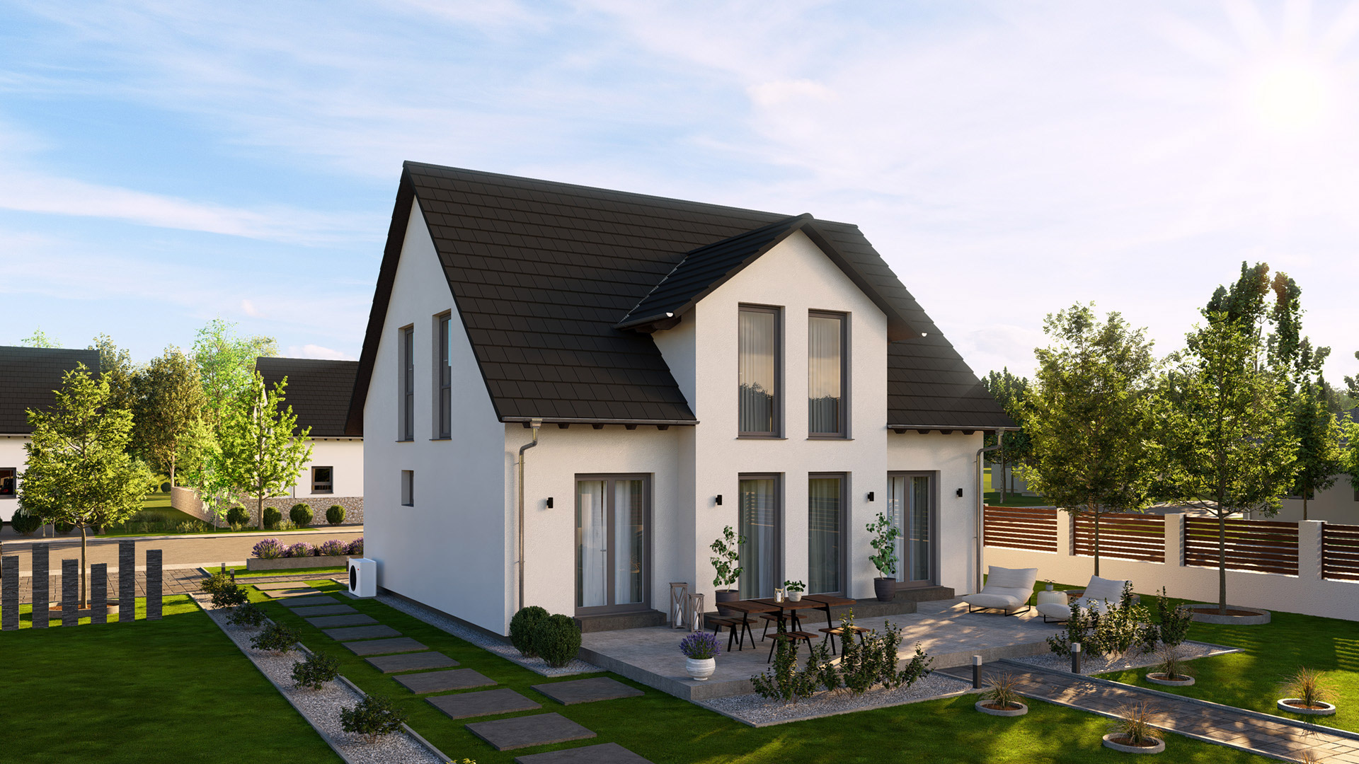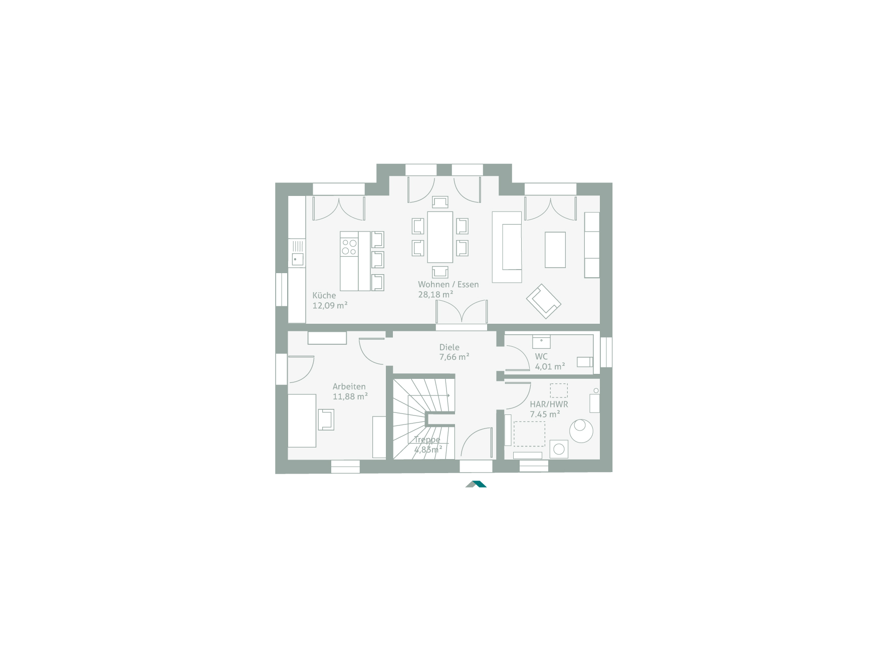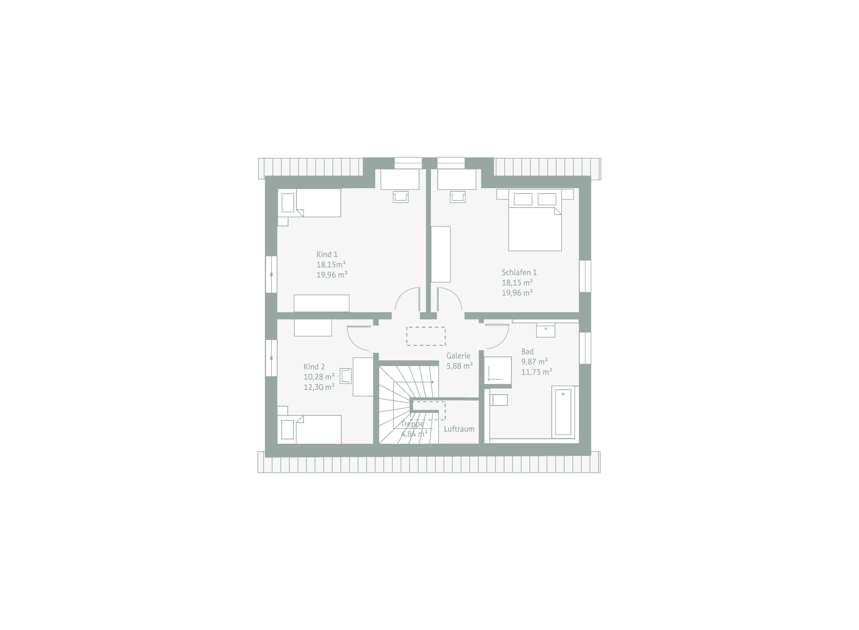Dieses Einfamilienhaus mit Satteldacherker verbindet zeitloses Design mit optimaler Raumausnutzung. Der charakteristische Erker sorgt nicht nur für ein ansprechendes Erscheinungsbild, sondern schafft auch im Inneren ein helles und freundliches Ambiente. Der offene Koch-, Ess- und Wohnbereich bildet das Herzstück des Hauses und bietet viel Raum für gemeinsame Aktivitäten. Im Erdgeschoss finden sich zudem ein praktisches Gäste-WC und ein vielseitig nutzbarer Arbeitsraum. Der helle Treppenbereich mit offenem Luftraum verleiht dem Haus eine luftige Atmosphäre. Im Obergeschoss befinden sich drei großzügige Schlafzimmer sowie ein geräumiges Badezimmer mit Dusche und Badewanne. Dieses Objekt ist ein perfektes Beispiel dafür, wie einfach unsere Objekte individuell angepasst werden können. Schauen Sie sich dafür den großen Bruder dieses Objektes an: DeinSteinHaus 186S.